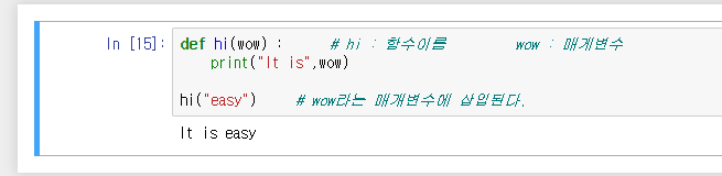 ๋๋ค. ํจ์์ด๋ฆ์ hi, ๋งค๊ฐ๋ณ์๋ wow์ด๋ฉฐ, ํจ์์ ๋ด์ฉ์ "it is"๋ฅผ ์ถ๋ ฅํ๊ณ , ๋ค์๋ ๋ฐ์์ค๋ ๋ณ์๋ฅผ ์ฝ์