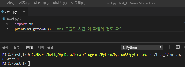 ์ค์ธ ๋๋ํ ๋ฆฌ ๊ฐ ๋ฉ๋๋ค. ๋ฐ๋ผ์ ๋ฐฉ๊ธ os.gercwd๋ฅผ ์ปดํ์ผ ์ํจ ์ ํ์ผ์ c:/test_1/ ์ ์๋ awef.py ํ์ผ์
