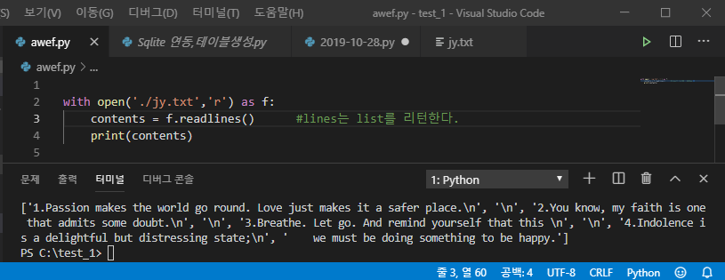 readlines๋ฅผ ์ฌ์ฉํ๋ฉด, ์์ฒ๋ผ listํํ๋ก ์ถ๋ ฅ๋๊ฒ ๋ฉ๋๋ค.