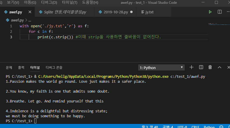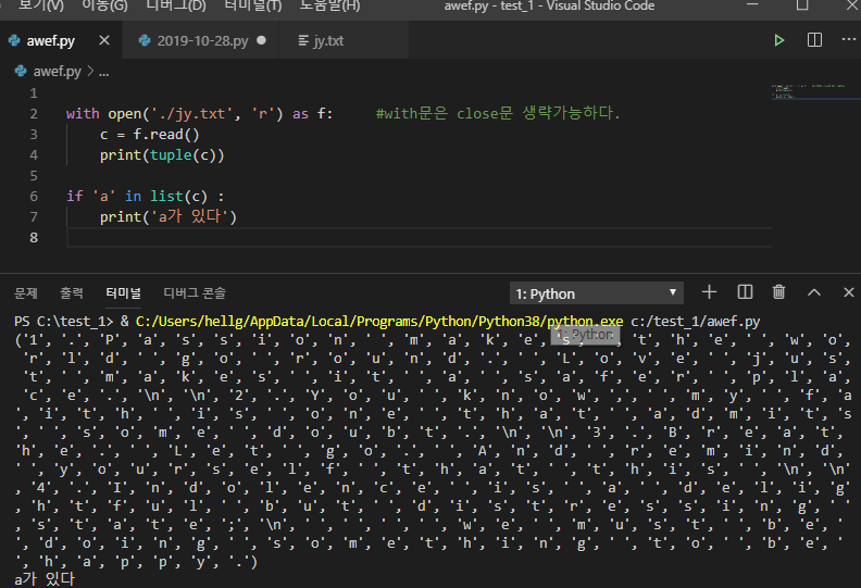 ์ด์ฒ๋ผ with open()์ ์ฌ์ฉํ๊ฒ๋๋ฉด close.()๋ก ๋ซ์์ฃผ์ง ์์๋ ๋ฉ๋๋ค. ๊ทธ๋ฆฌ๊ณ ํ์ผ์ list๋ tupleํํ๋ก๋ ์ถ๋ ฅ ๊ฐ๋ฅํฉ๋๋ค.