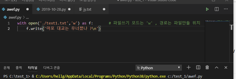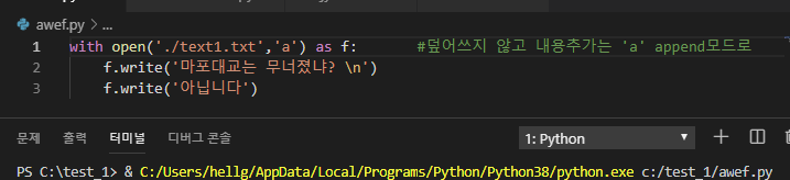 ์ง์ ํ ๋๋ ํ ๋ฆฌ์ text1.txt ํ์ผ์ด ์๊ฒผ๊ณ , ๋ด์ฉ๋ ์ ๋ค์ด๊ฐ์์ต๋๋ค. write์์ ์ฃผ์ํ ์ ์ '๋ฎ์ด์ฐ๊ธฐ'๋ผ๋ ๊ฒ์