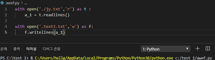 ์ธ 4์ค์ด ์ ํ์๋ jy.txtํ์ผ์ ๋ฆฌ์คํธํํ๋ก ๋ฐ์์ ์๋ก์ด ํ์ผ text3.txt์ ์จ๋ณด๊ฒ ์ต๋๋ค.