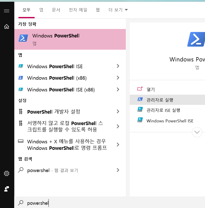 1. powershell์ ๊ด๋ฆฌ์ ๋ชจ๋๋ก ์ด์ด์ค๋ค.